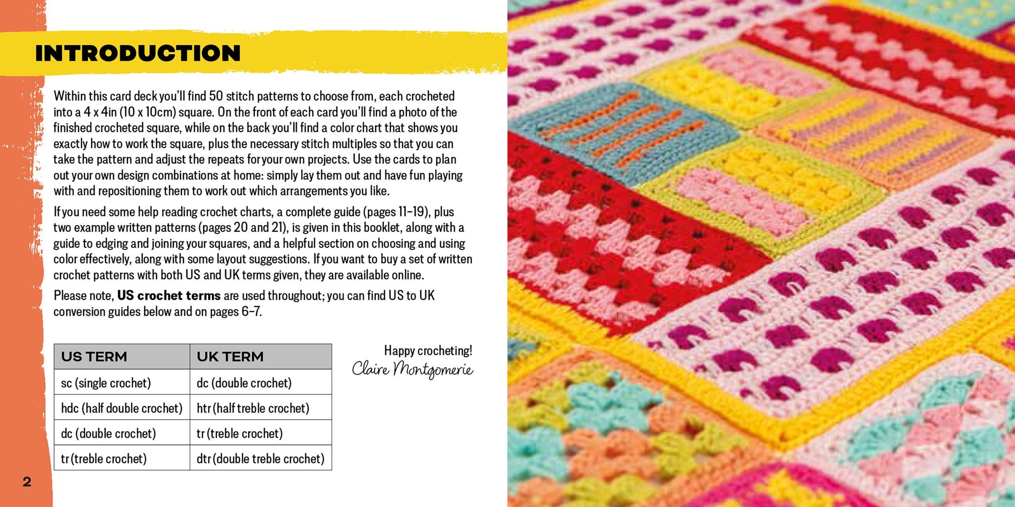 Created to complement The Granny Square Stitches Card Deck, a digital collection of written patterns is available for crocheters who love the colour and style of the designs but prefer to read words rather than charts. All 50 granny patterns are written out using both US and UK crochet terminology for ease of use.
